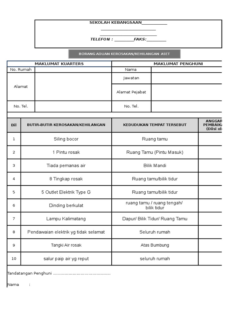 Contoh Borang Aduan Kerosakan Kuarters Guru