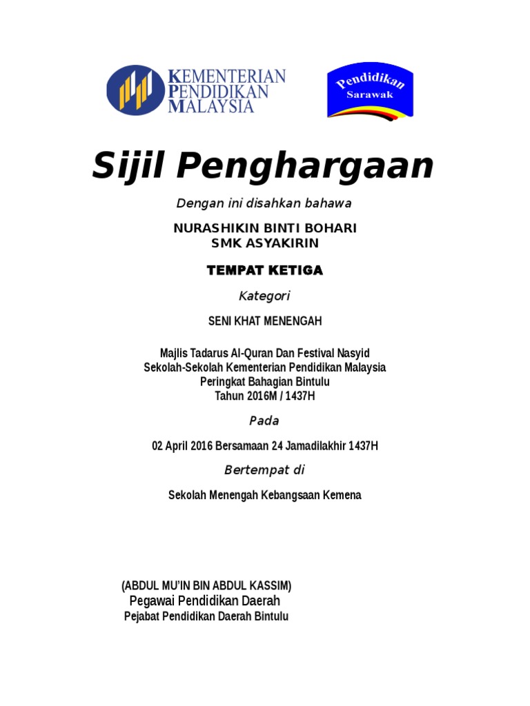 Contoh Sijil Penghargaan Mtq Pemenang
