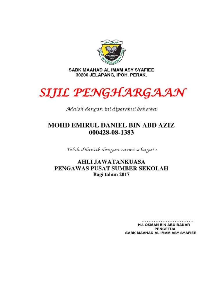 En hazayi b othman telah mencurahkan khidmat dengan dedikasi serta iltizam. Nurafrina bt omar bashir 021121 14 0150 telah memperoleh. Sebagai contoh pelaksanaan program kursus kepimpinan pelajar program sukan sekolah program 3k bulan panitia ataupun hari kecemerlangan murid dan macam2 lagi. Sijil penghargaan dengan ini disahkan bahawa ahmad bin abu samah 123456 78 9000 sebagai peserta hakim ahli jawatankuasa telah mengikuti dan memberi kerjasama yang erat dalam menjayakan pertandingan memasak 2015 unit beruniform pada 12 mac 2015 tempat kantin sk lahad datu iii anjuran unit kokurikulum sk lahad datu iii encik talib bin kaning guru besar sk lahad datu iii.
