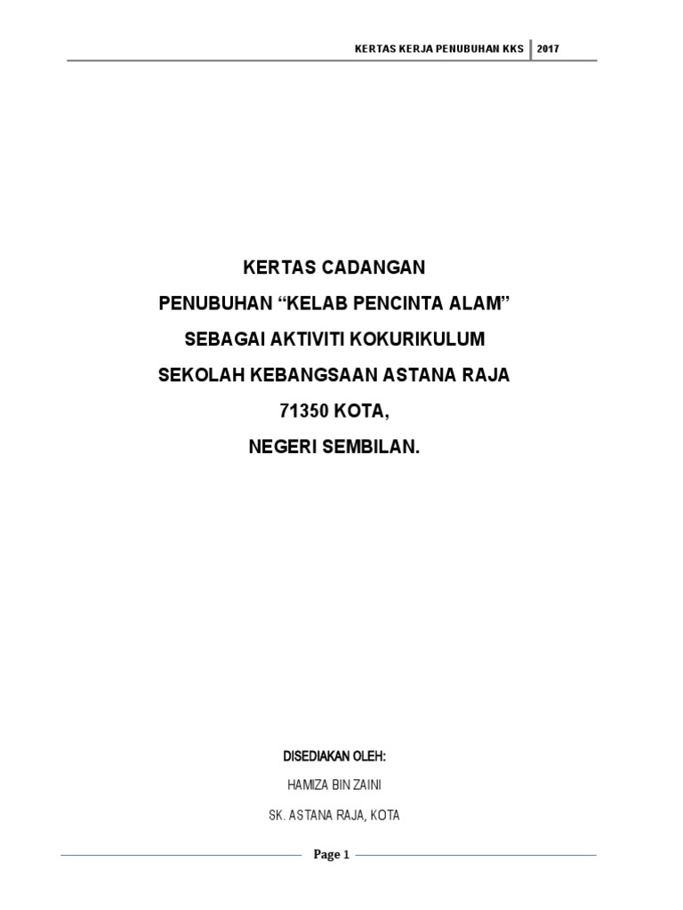 Kertas Cadangan Penubuhan Kelab Pencinta Alam Sebagai Aktiviti Kokurikulum Sekolah Kebangsaan Astana Raja 71350 Kota Negeri Sembilan