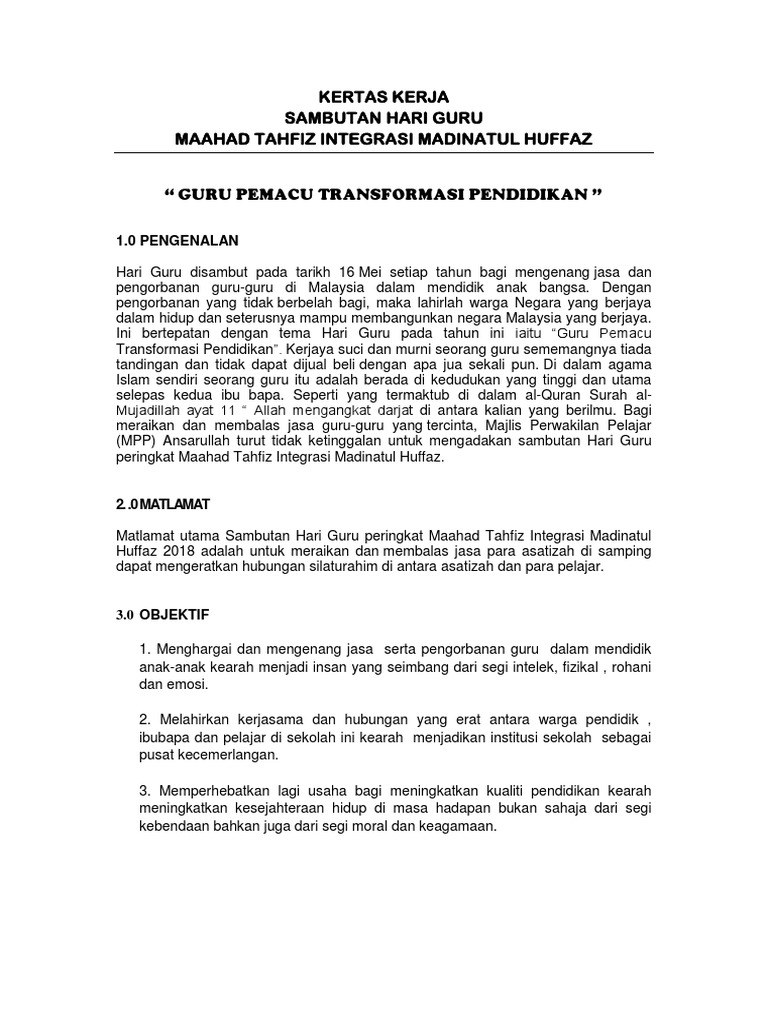 Guru Pemacu Transformasi Pendidikan Kertas Kerja Sambutan Hari Guru Maahad Tahfiz Integrasi Madinatul Huffaz