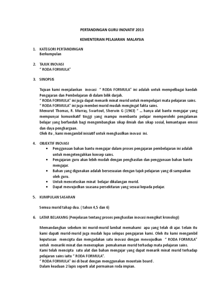 Kertas Kerja Pertandingan Guru Inovatif 2013 Roda Formula Sains