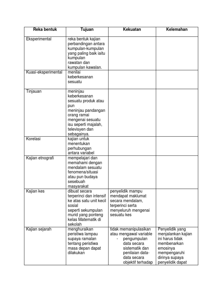 Reka bentuk kajian kes. Reka bentuk kajian eksperimental eksperimental kuasi eksperimental bukan eksperimental korelasi tinjauan kes etnografi jenis reka bentuk kajian 5. Etnografi mengkaji ciri ciri budaya dan kehidupan sesuatu kumpulan atau komuniti. Fasa kedua melibatkan kajian literatur reka bentuk kajian instrumentasi dan kaj ian awal kajian. Ia juga berfungsi sebagai panduan dalam membantu penyelidik dalam proses memungut menganalisis dan membuat pentafsiran hasil daripada penyelidikan yang dijalankan.