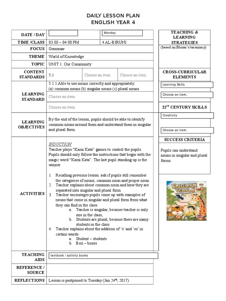 Template Rph Eng Year 4 2017 Lesson Plan Education Theory