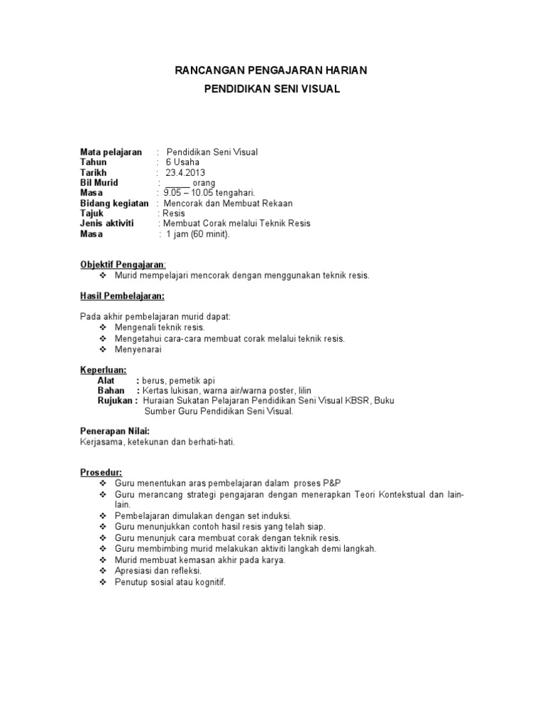 Doc Rancangan Pengajaran Harian Pendidikan Seni Visual Bil Perkara Dyana Nonong Academia Edu