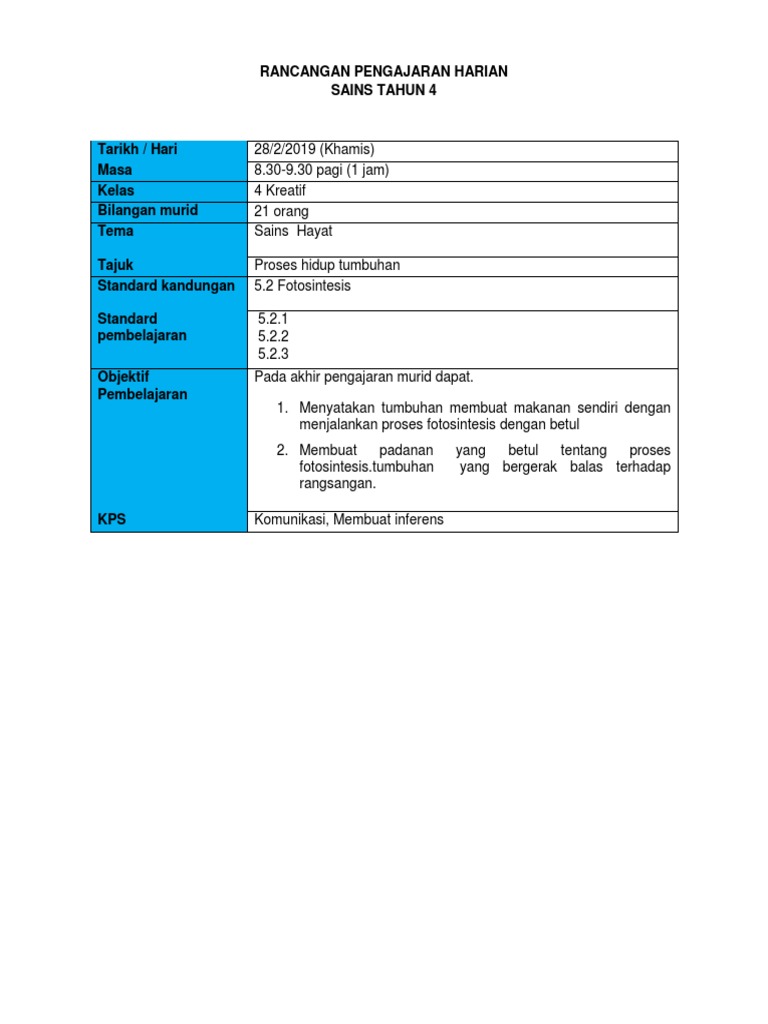 Rancangan Pengajaran Harian Sains Kssr Tahun 4