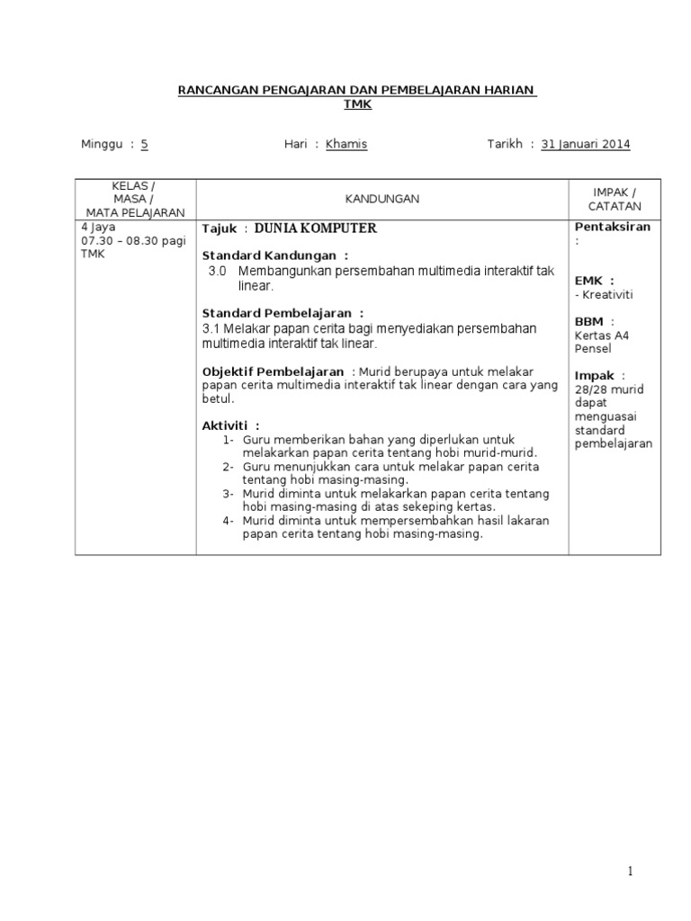 Rancangan Pengajaran Harian Rph Tmk Tahun 4 Elemen Multimedia