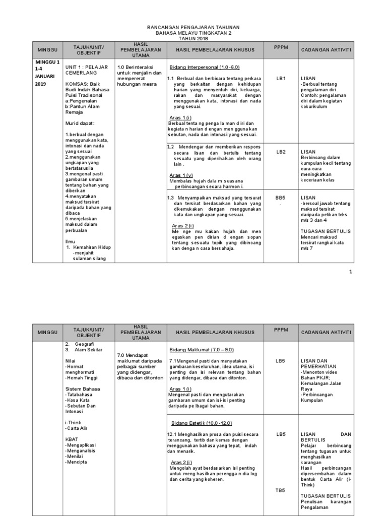 Rpt Rancangan Pengajaran Tahunan Tingkatan 2 Subjek Bahasa Melayu