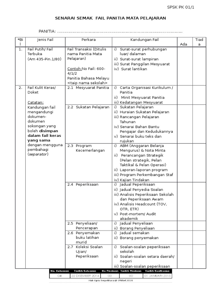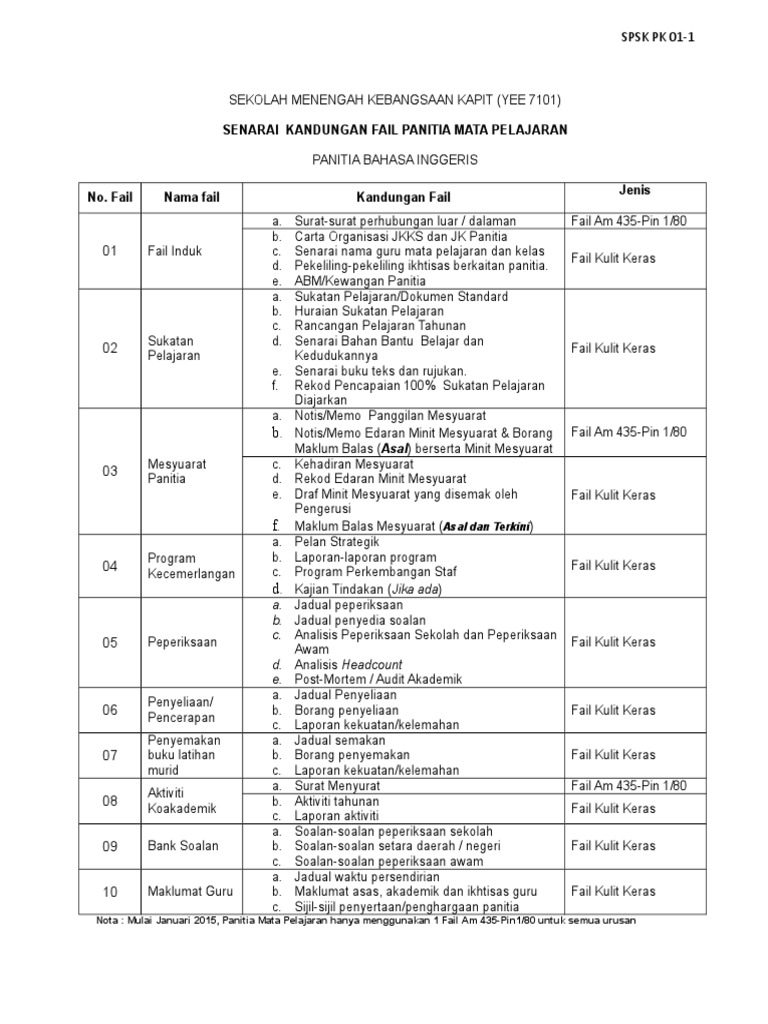 Pk01 1 Senarai Semak Kandungan Fail Panitia