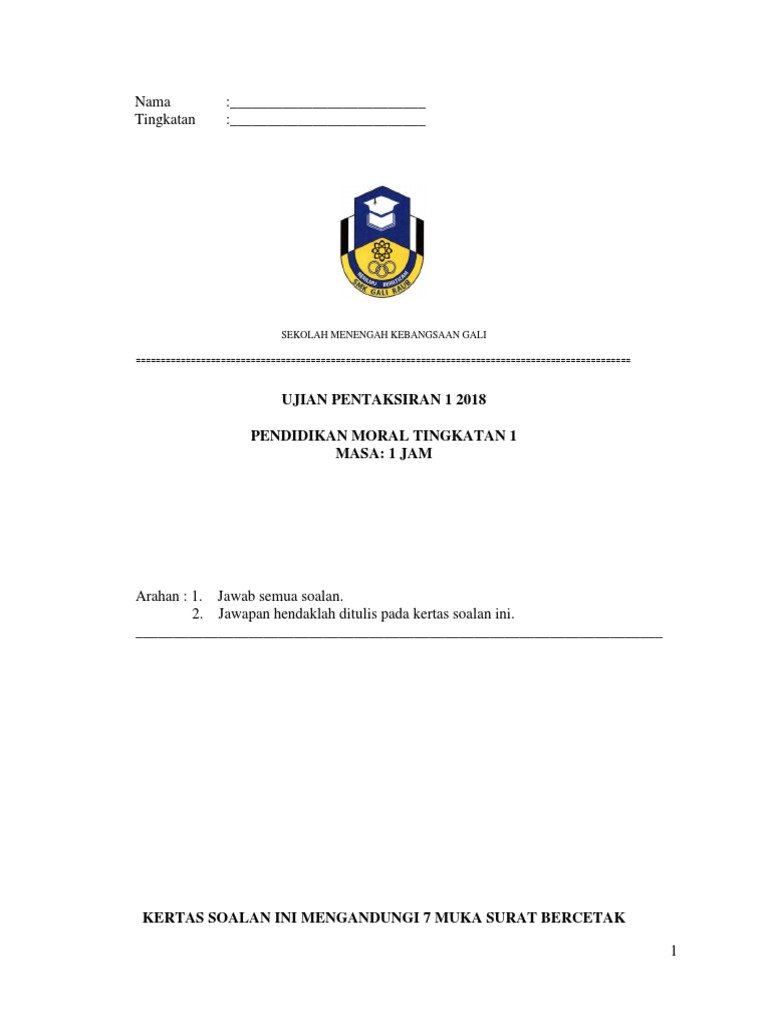 Soalan Peperiksaan Pertengahan Tahun 2018 Kssm Tingkatan 1 Pendidikan Moral