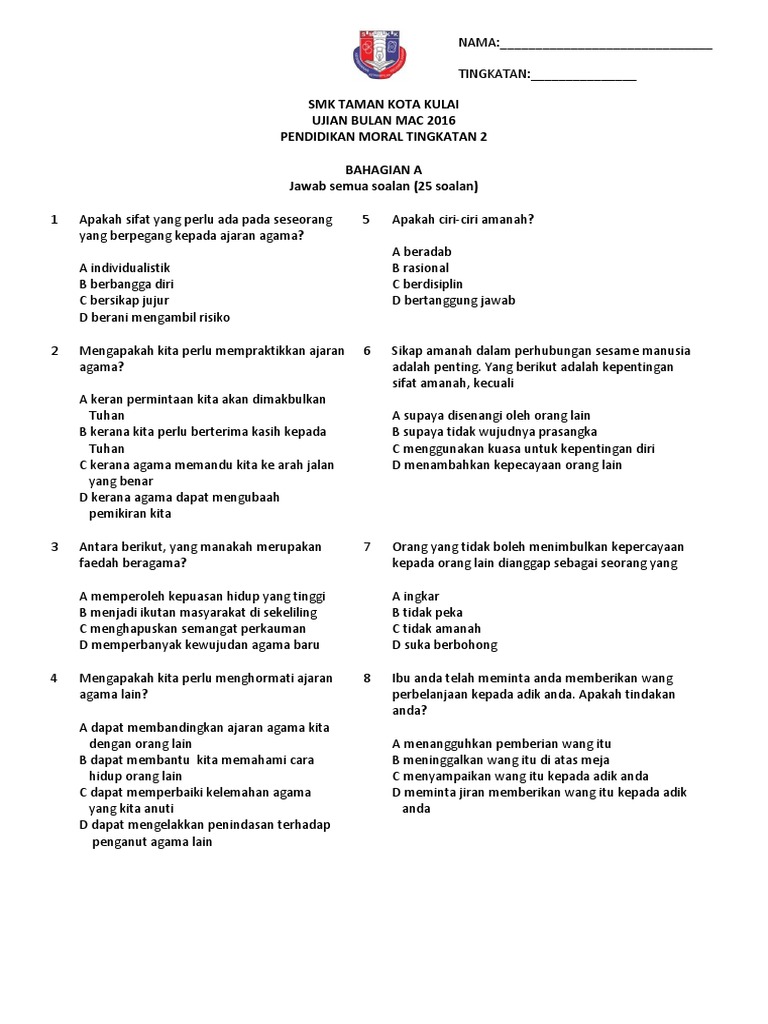 Soalan Ujian Mac Pendidikan Moral Tingkatan 2