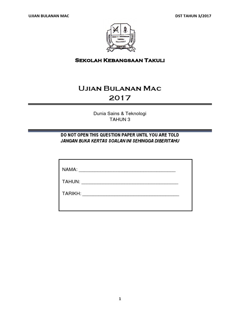 Soalan Dst Dunia Sains Teknologi Tahun 1 Ujian 3 Bulan Mac 2018 1